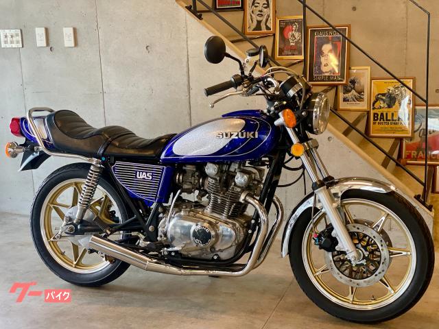 スズキ GS400 ブルーシルバーラメ 星形キャストホイール メッキ集合管 絞りハンドル タックロールシート