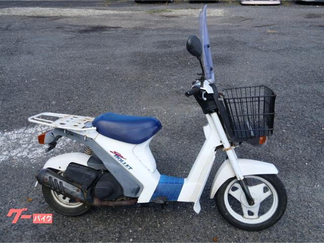珍しい形のスクーターです。新聞配達等ビジネスバイク要素を持つため高剛性な軽量フレームにフロント12インチの安定性ツーストのタフでパワフルなエンジンがたまりません。サイドスタンドや大きな風防にかごにキャリアで積載もいいので原付キャンプツーリングも楽しそうです。パワフルなツーストのキャブ車ですのでカスタムしても楽しいと思います。試運転40km確認済み