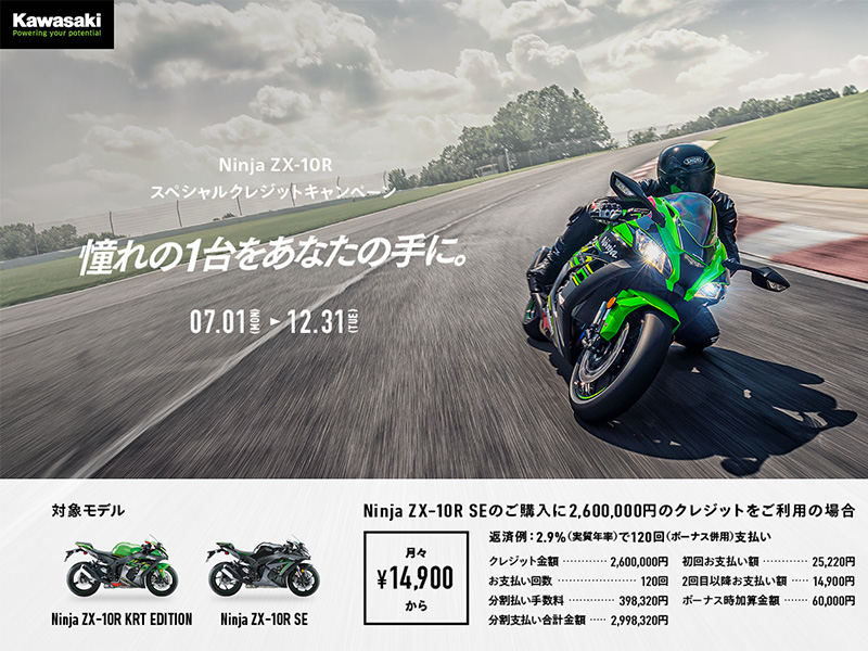 カワサキは2019年7月1日(月)~12月31日(火)まで「Ninja ZX-10R スペシャルクレジットキャンペーン」を開催する。