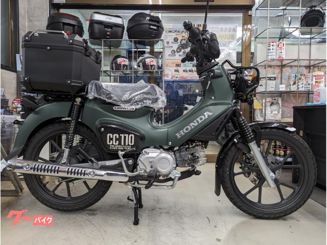 野山にも都会にも映える新しいトレッキングバイク!リヤボックス装着例カスタムご相談ください! クロスカブ110が進化しました。ロングストロークの新エンジンを搭載し、力強い走りと、省燃費を両立。フロントディスクブレーキを採用することで、高い制動力を追求。さらに車輪ロックを回避する1チャンネルABSも標準装備し、制動時の安心感をより高めました。キャストホイールとチューブレスタイヤを採用。よりパンク時の修理がしやすくなりました。シフトチェンジは、停車時のみロータリー式となる4段リターン式。運転する楽しさも感じられます。クロスカブ110には、液晶を追加。ギアポジションと燃料計を常時表示し、時計/TRIP/走行距離/平均燃費を切り替えで液晶表示することが可能で便利な仕様になりました。