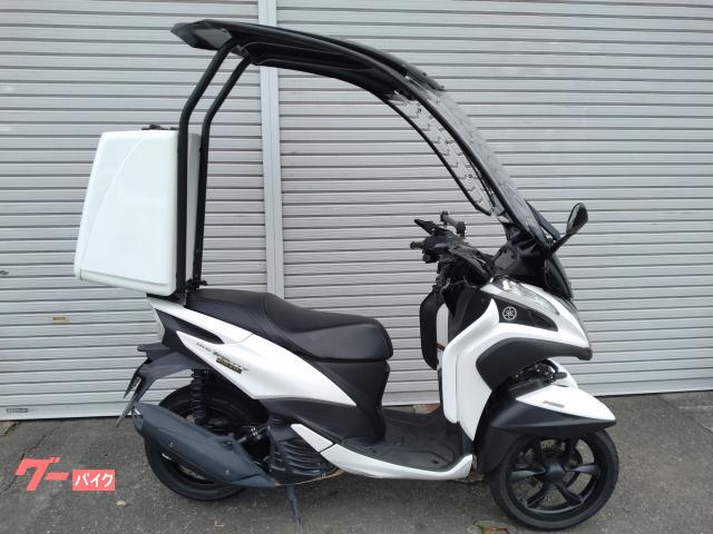 安定感抜群の屋根付きフル装備のトリシティー155ABS、通勤に仕事に大活躍してくれます トリシティーだからルーフが付いていても安定感抜群です。ルーフはほとんど傷も無く透明感OK!しかもオーバールーフが付いているのでルーフの幅が半端じゃない。足元もオーバーレッグシールドが付いているので雨の巻き込みもとても少ない。手元はナックルバイザーとグリップヒーターで指のかじかみも殆んど無し。これなら雨の日も寒い日も快適走行間違い無し。荷物もシート下のトランクとリヤBOXが付いているので沢山積める。トランクには照明付きなので暗い所でも中が良く見える。リヤBOXの中もとても綺麗。ハンドル上部にはアクセサリーバーも付いていてとても便利に使えます。タイヤも交換したばかりです。通勤に仕事にお薦めの一台!
