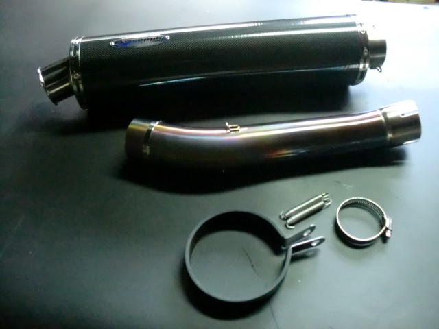 週末発送分です。 『インペリアル KSR110用』 カーボンサイレンサーとアルミサイレンサーです。 どちらもΦ86のサイレンサーと言っていますが サイレンサーの素材がアルミ二ウムとカーボンでは肉厚が違うので、 円周にすると結構違ってきます。 ですのでサイレンサーバンドがそれぞれ専用となります。 バンドはし…