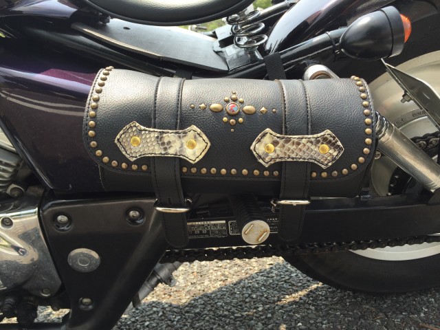 既製品のツールバッグにパイソンレザーとスタッズで装飾しました!