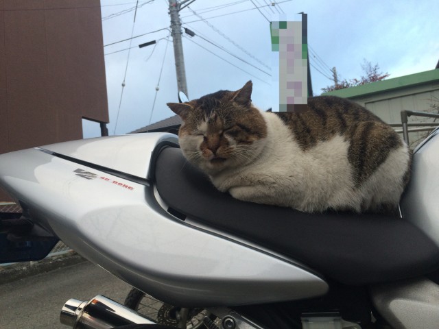 にゃ太郎(自称、我が家の飼い猫)はバイクのシートが好きらしい(^ ^)