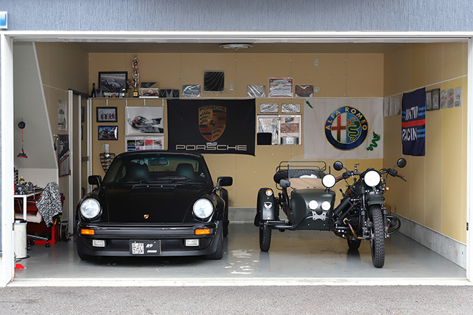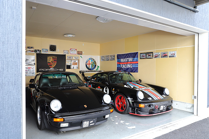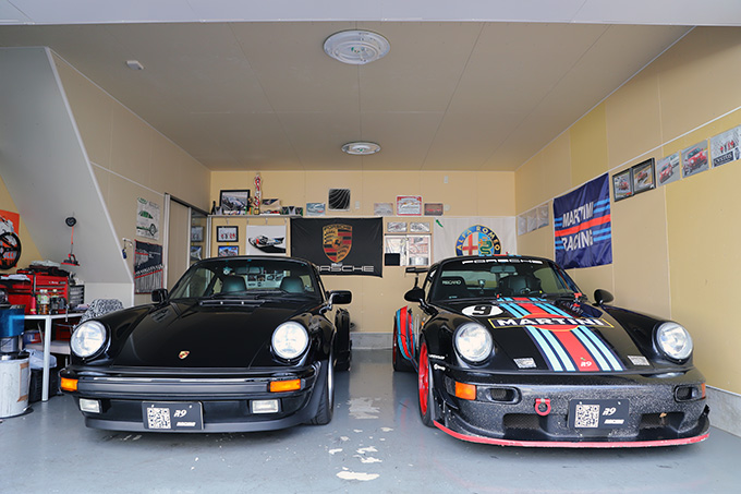 ガレージには自身が所有するポルシェ930ターボとアルファロメオMitoを格納することが多いが、チームのポルシェ964も整備作業を行うため、3台をかわるがわる車庫に収めているという。