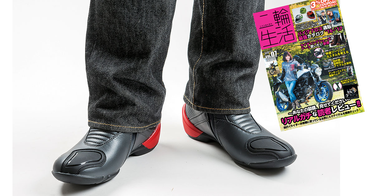 スマートなデザインながら、くるぶしには急激な衝撃を受けると瞬時に硬化して、衝撃を吸収・分散させる新素材を採用しています。人間工学に基づいた立体構造のアウトソール(靴底ですね)と、心地よさを追求した高機能インソールを装備した、ライディングシューズです。