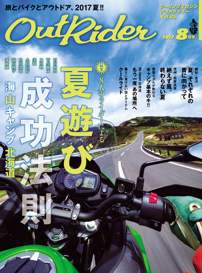 全国1千万ツーリング・ファンのみなさま、お待たせしました! アウトライダー8月号は、一年のうちで一番‘バイク’な季節「夏」に照準を合わせてお届けします。シーサイド・ランに海水浴、山岳ワインディングに夏山トレック、高原キャンプにBBQ、北の大地にも出かけちゃおう! というわけで、今月号は「夏の遊び方」大特集。「夏遊び成功法則」と題して、〈海・山・キャンプ・北海道〉を舞台にバイクでの楽しみ方をご提案。さあ、アナタの夏は、どんな夏!? 誌面でお待ちしております!