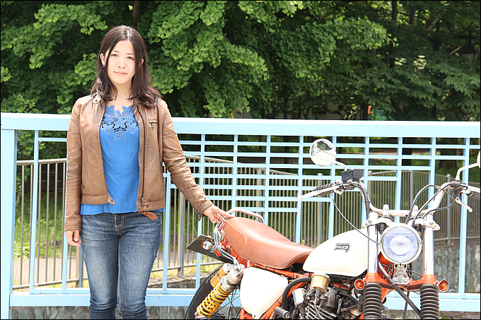 透き通るような白い肌と凛とした佇まいが魅力的な中原さん。そして、そんな彼女が跨がるのは、相反したイメージの無骨さが漂うカスタマイズドSR。はたして彼女はなぜバイクに乗り、SRを選んだのだろうか……。