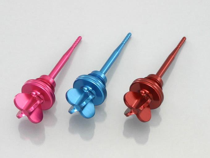 カラフルな色合いとハート型デザインが目を引く、アルミ削り出しのアルマイト仕上げオイルレベルゲージ