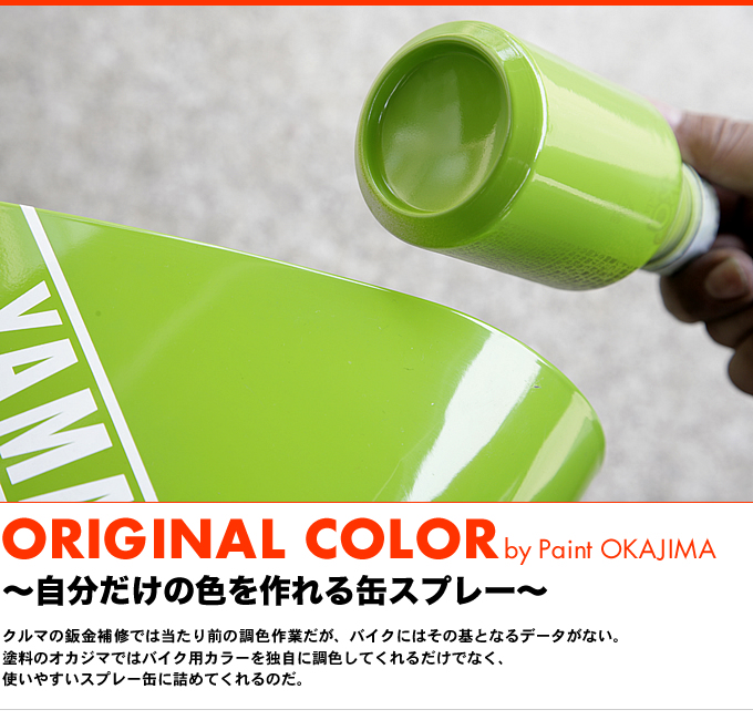 クルマの鈑金補修では当たり前の調色作業だが、バイクにはその基となるデータがない。塗料のオカジマではバイク用カラーを独自に調色してくれるだけでなく、使いやすいスプレー缶に詰めてくれるのだ。