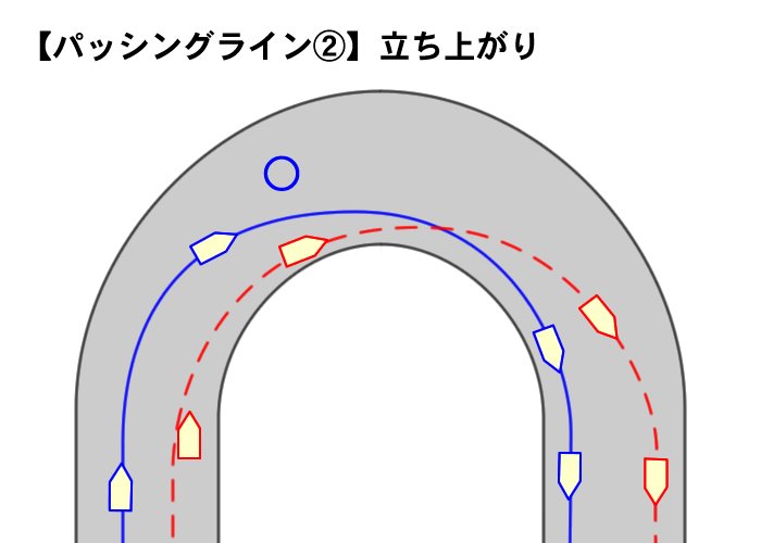 | パッシングライン:立ち上がりで抜く場合 最も安全なパッシング方法。前走者のアウト側後方からコーナーに進入し、加速重視の直線的なラインで立ち上がり相手を追い抜きます。前走者とあまり距離を詰めすぎず、少し進入速度を抑えてコーナー前半で早めにマシンの向きを変えておくのがポイント。前走者にパワーで勝る場合は特に有利です。進入で抜かれてまた抜き返す、レースでもおなじみのシーンですね。 |