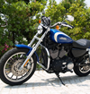 フロントにスポークホイール、リアにキャストホイールを組み合わせることで、カスタムルックを演出したXL883C(スポーツスター883カスタム)。エンジンがクロームメッキ仕様になっているのもカスタムの特徴で、他のスポーツスターにはないゴージャスな雰囲気を持っています。また、フォワードコントロールを採用しているのもポイントです。