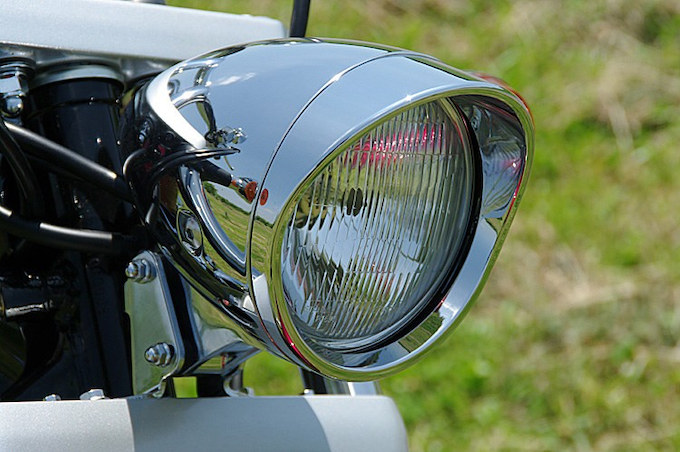 09クロームメッキが美しい砲弾タイプのヘッドライト。フロントフォークにはヨーク角がつけられている。
