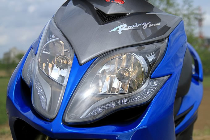 ヘッドライトは、ロー/ハイビームともに左右2灯両側が光るマルチリフレクタータイプ。下部には、高級四輪車を思わせるLEDランプを使ったイルミネーションモールがあしらわれていて、クラスレスな高級感がある