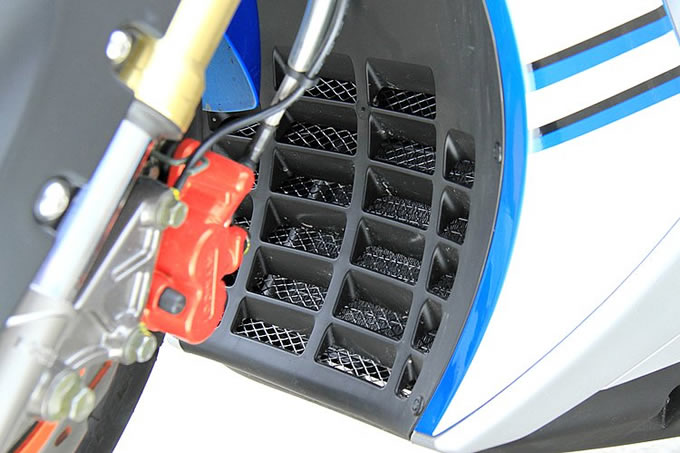 同じレーシングシリーズの125と150が空冷エンジンを搭載するのに対し、この180はよりハイパフォーマンスが期待できる水冷エンジンを採用。ラジエターは車体前方下部、前輪のすぐ後ろに配置されている