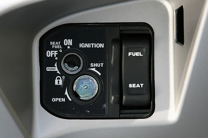 ハンドルロック時には自動でシャッターが閉まる、防犯性の高いメインキーシリンダーを採用。シートやガソリン給油口の解錠は、メインキーをオンとオフの間に回して、シリンダー右側にあるスイッチを押すことで行うことができる。