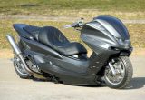 フルエアロながらもシンプルで細かい所まで行き届いた上質なたたずまいのフォルツァは、カスタムショップエタニティが製作した一台だ。見所はフォルツァでは珍しい大型のアンダーカウルだろう。エアサスでマイルドに下げても、ガッツリとグランドスラムしてしまう視覚的効果は非常に大きい。そのほか、高級感あるボタン加工のシートやシルバーカーボンのコンパクトなレイアウトのマフラーも見どころのひとつ。