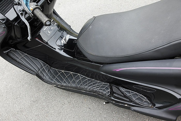 ステップマットはオリジナルでオーダーしたもので、レザーにスパイダー風のステッチ入り。ベースの素材から色、ステッチの色やパターンまで、自分の好みを反映できるステップマットが作れるのも同店の強みなのだ。