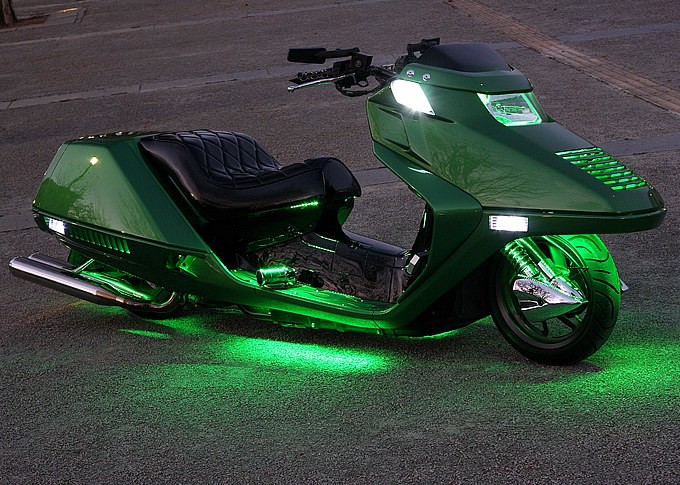 リアカウルのチョップ加工、そしてノーズバンパーのスムージングを巧みに取り入れた、シンプルだが通をも唸らせる一台に仕上げられたサザンクロスのフュージョン。グリーンに対する一貫性はナイトシーンを彩る電飾にも表れ、外装デザインの特性を生かしつつ緑の光源は徹底して隠すスタンスを追求! パッと見レベルでは、どこから照らしているのかまず分からない高度なアプローチの電飾メイクなのだ。ここまでやり込んでいれば、当然電飾のカスタム費用は高いと思いきや、サザンクロスではビッグスクーターなら車種問わずパーツ代&工賃込みで一律料金(詳しくはお問い合わせを!)が設定されている。