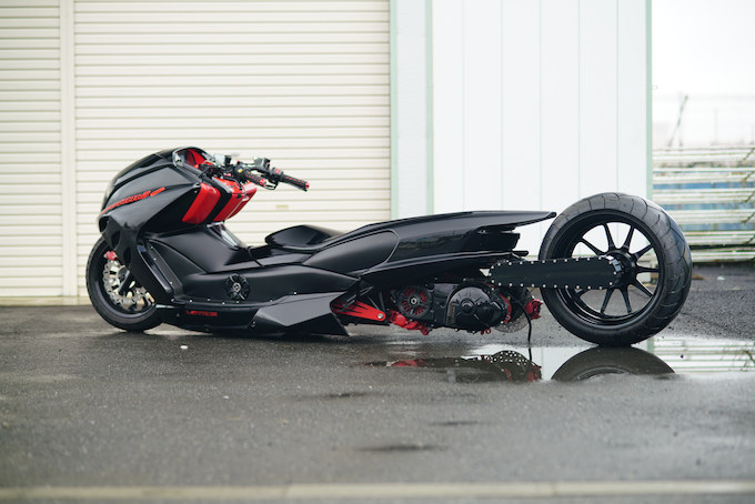 エアーサスペンションでスラムドされた低さ、そして300サイズの強烈なインパクトを放つリアまわり。ビッグスクーターカスタムにおけるある意味最終段階ともいえるのが、このスタイルだ。