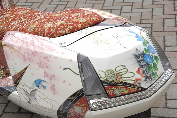 リア周りにもアサガオ、五重塔、毬、桜などを塗装。どれかひとつだけでも手間がかかる作業なのに、これだけのモチーフを1台で表現したのは、なんとも贅沢の極みだ。この塗装作業にかかった労力はどれほどのものか、想像してほしい。
