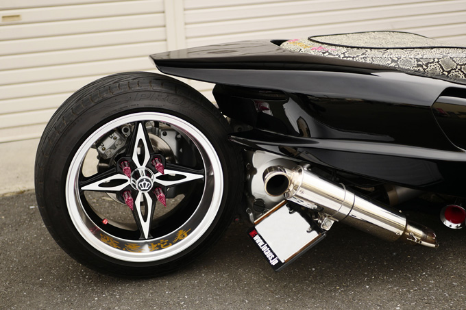 14インチ、8Jのリアホイールの存在感に合ったリアカウル。こちらはやはりロータス製の4D9マジェスティ用を使用。男らしいスタイルのスポイラーに超極薄のリアテールまわりが印象的なデザインだ。