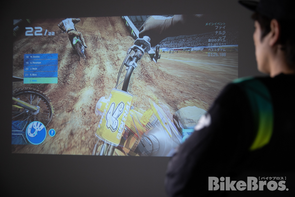 「確かに視点はこのほうが実際に走る感覚に近いですね。ゴーグルに土がつくと視界が悪くなるし、ティアオフ(ゴーグルのレンズについたビニール)を剥がすと視界が回復するので、本当に細かいところまでよく作り込まれていますね。目の端にちらっと客席が見えたり。レース中って、観客の声とかすごく聞こえるんですよ。ちょっとだけど、実際にスーパークロスを走った時の感覚を思い出すことができました」と大満足の様子。