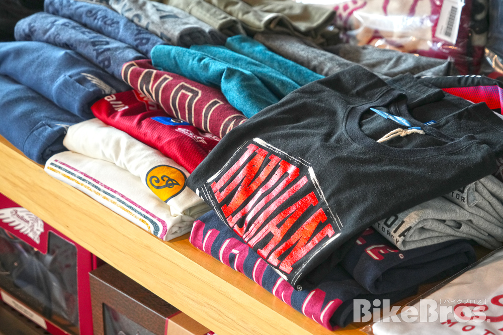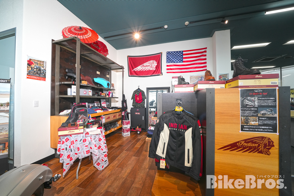 インディアンモーターサイクルは優れたパフォーマンスだけでなく、ファッション性に優れていることも人気のポイント。サッシュではアパレルやカスタムパーツのコーナーも常設されています。
