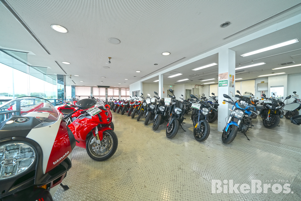 メインショールームの2階へと上がると、ずらりと並んだ海外のプレミアムブランドの車両が出迎えてくれます。よく見ると、ドゥカティではディーゼル社コラボなどの限定モデル、BMWではメガモトなど、まず見かけることがない希少モデルばかりです!