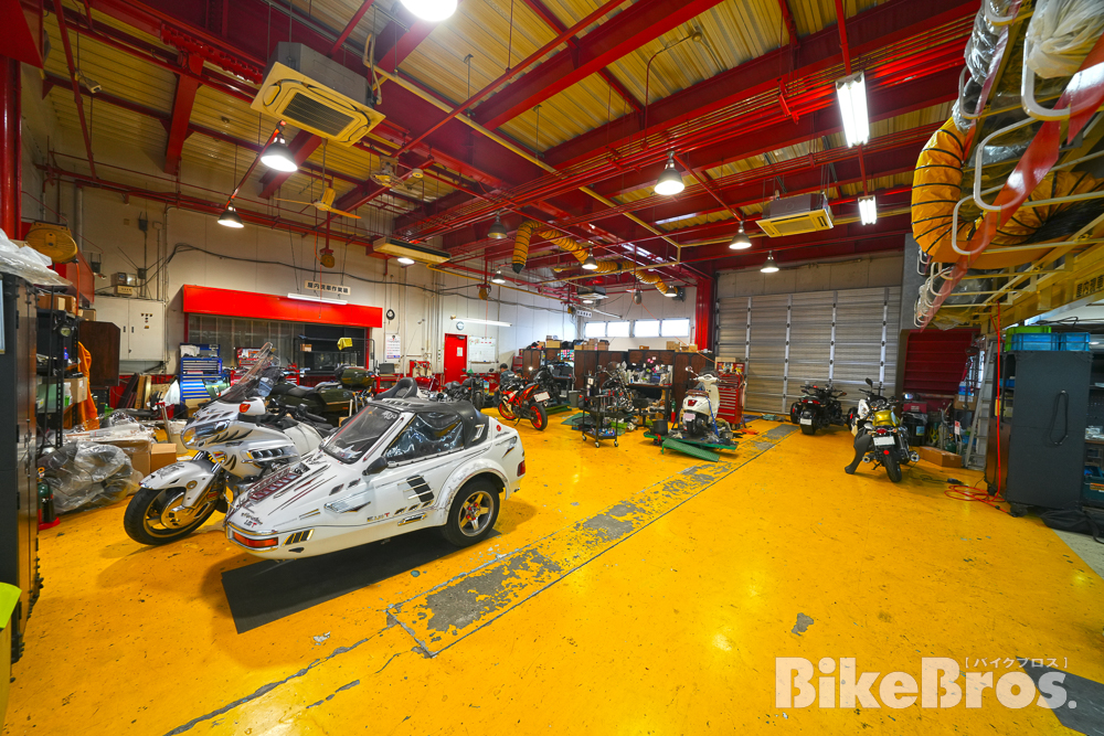 バイクショップのファクトリーとは思えないほど広々としたメンテナンススペース。トライクやサイドカーもばっちり対応できるうえ、それらの検査ラインを持つ認証工場でもあります。