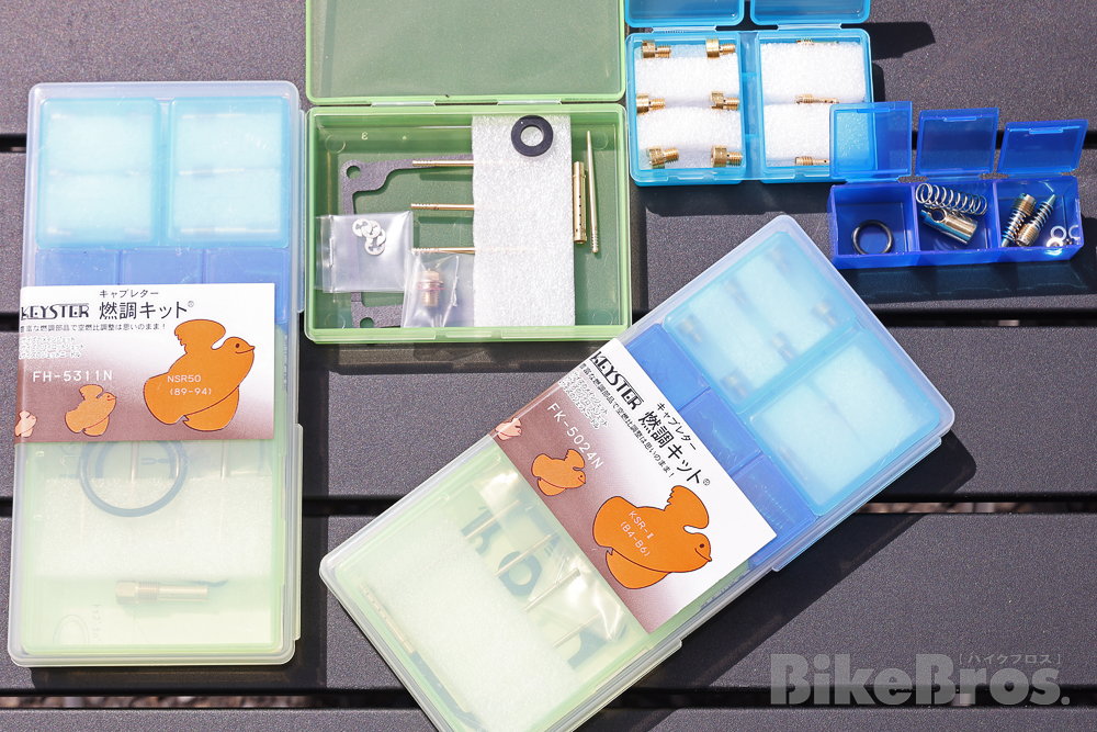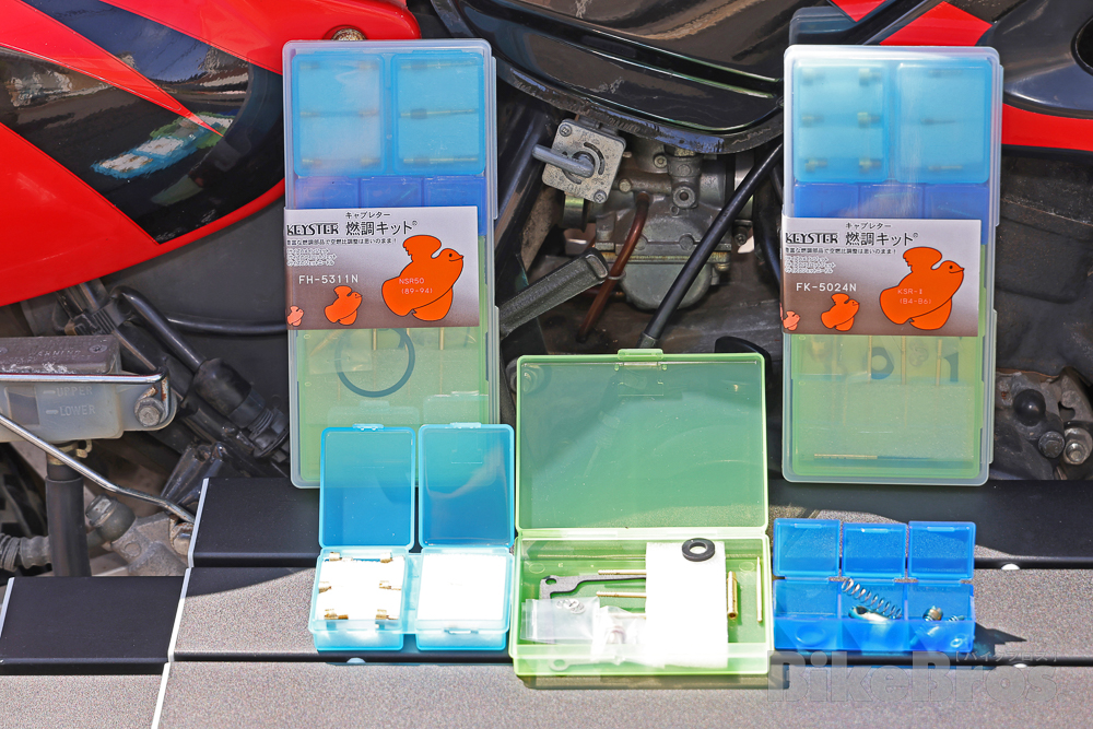 キースター「燃調キット」にはメインジェットやパイロットジェット、ジェットニードル、フロートチャンバーガスケットなど、キャブレター内部の構成パーツが車種別にすべてまとめて揃っているのが特徴だ。これにより、面倒なキャブレターのオーバーホールをとても簡単に行えるようになっている。さらにもう一つの特徴として、ジェット類やニードルは数サイズがセットされている点が挙げられる。これでノーマルはもちろん、マフラーやエアクリーナーなどを交換した際、カスタムに応じて最適なセットアップもできるという、文字通り「燃調キット」としても使える商品なのだ。そんな便利なキースターの「燃調キット」には、どんなパーツが入っているのだろうか。今回はカワサキKSR-Ⅱ用のキットを例に、その中身をじっくり紹介しよう。