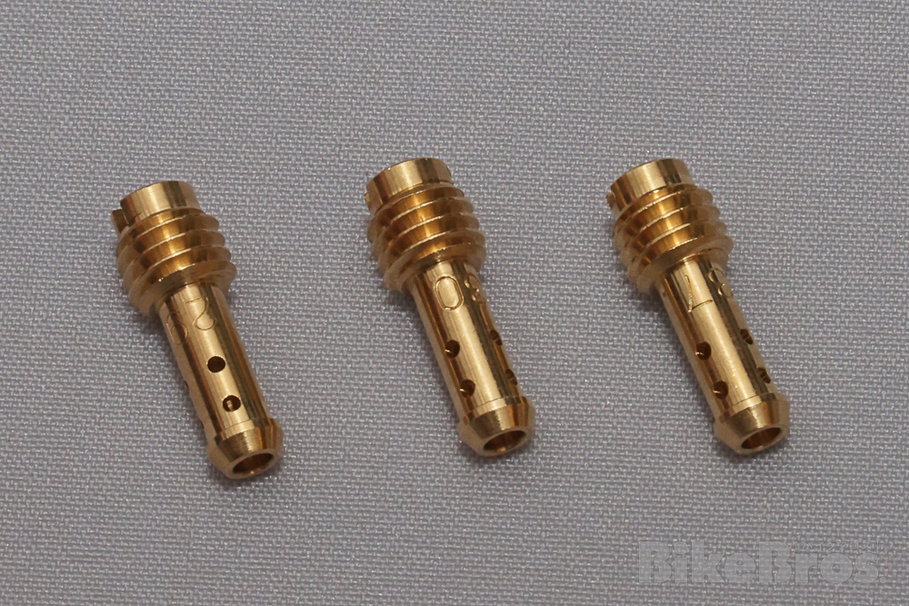 スロージェットとも呼ばれる。アイドリング~スロットル開度1/4付近(低速域)の燃料供給量を決めるパーツ。メインジェットと同様に#30などの数字が表記され、キースター「燃調キット」には3種類が用意されている。