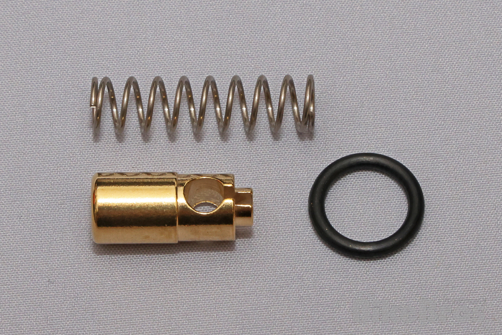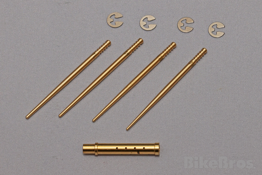 メインジェットに刺さる針状のパーツ。スロットルバルブに連動して上下し、メインジェットとの相互作用によって、スロットル開度1/4~3/4付近(中速域)の燃料供給量を決める働きをする。ニードルの溝にEクリップをはめる位置によって燃調を変化させるほか、ニードル自体の番手(テーパーの角度が違う)の変更でも燃調は変化する。キースター「燃調キット」には4種類が付属。写真下のパーツはニードルの受けとなる筒状の「ニードルジェット」というパーツだ。