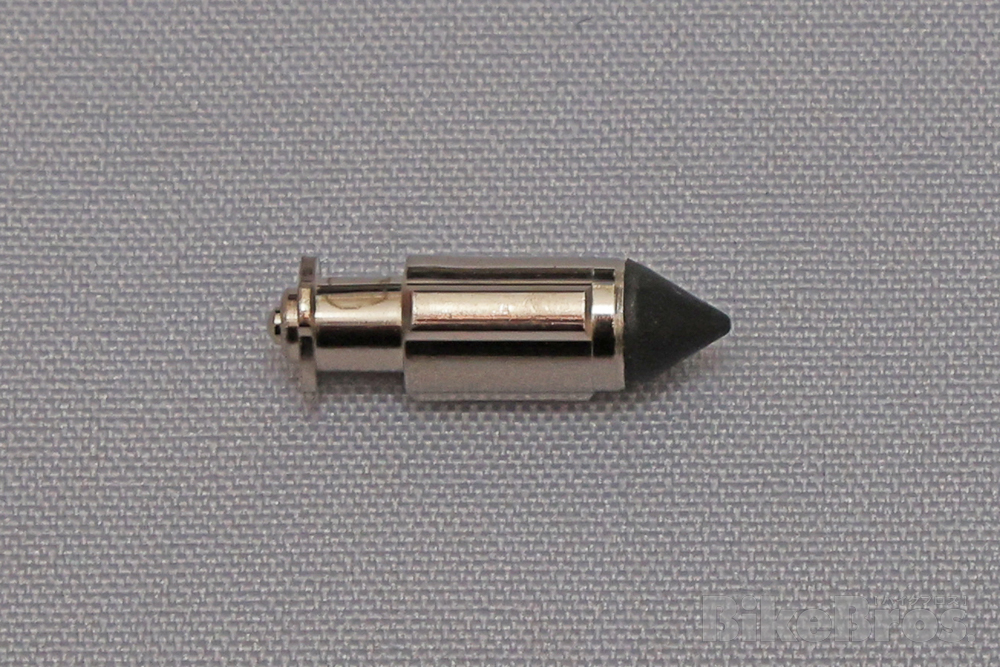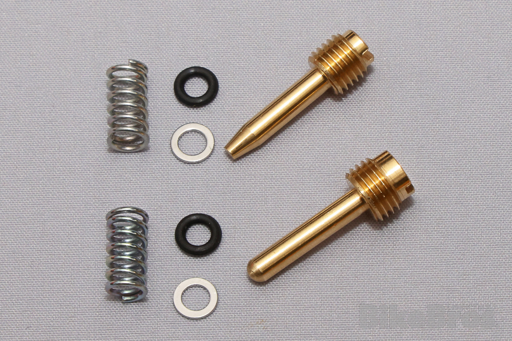 フロートチャンバー内のガソリン油面を一定に保つため、フロートと連動してガソリンの通路を開閉する役割を持つのがニードルバルブと、外側にある筒状のバルブシートだ。2つのパーツの接触幅はきわめてデリケートだが、キースター「燃調キット」では非常に高い工作精度で要求を満たしている。写真のKSR用は純正に準じた金属製(洋白製研磨ニードル)だ。