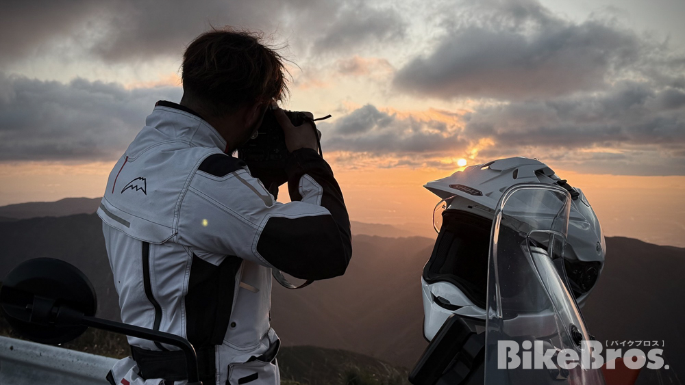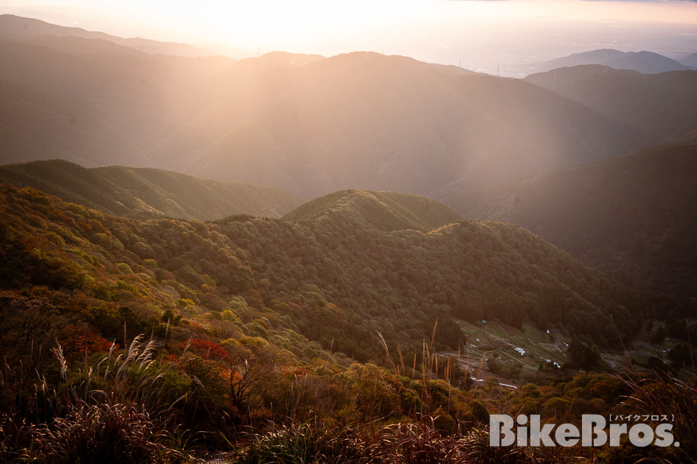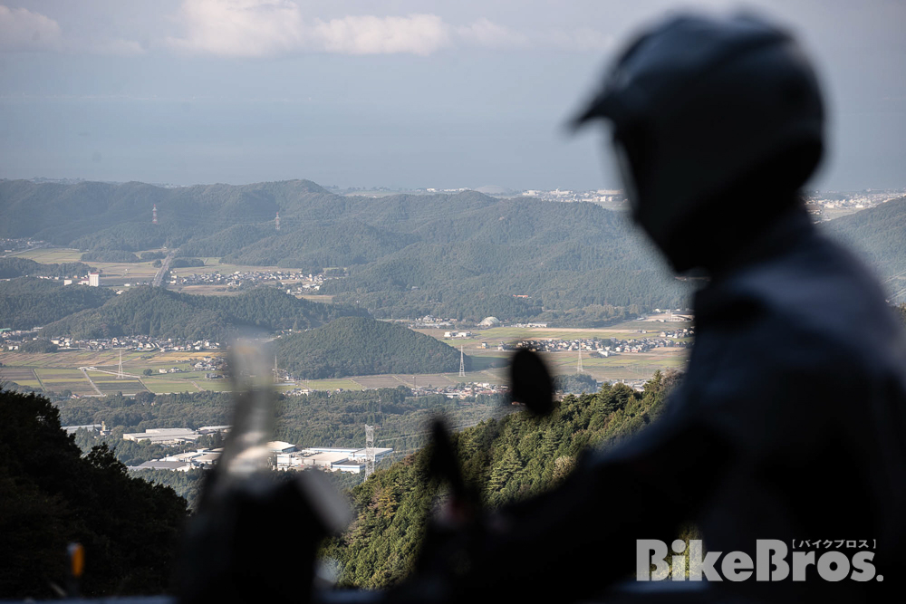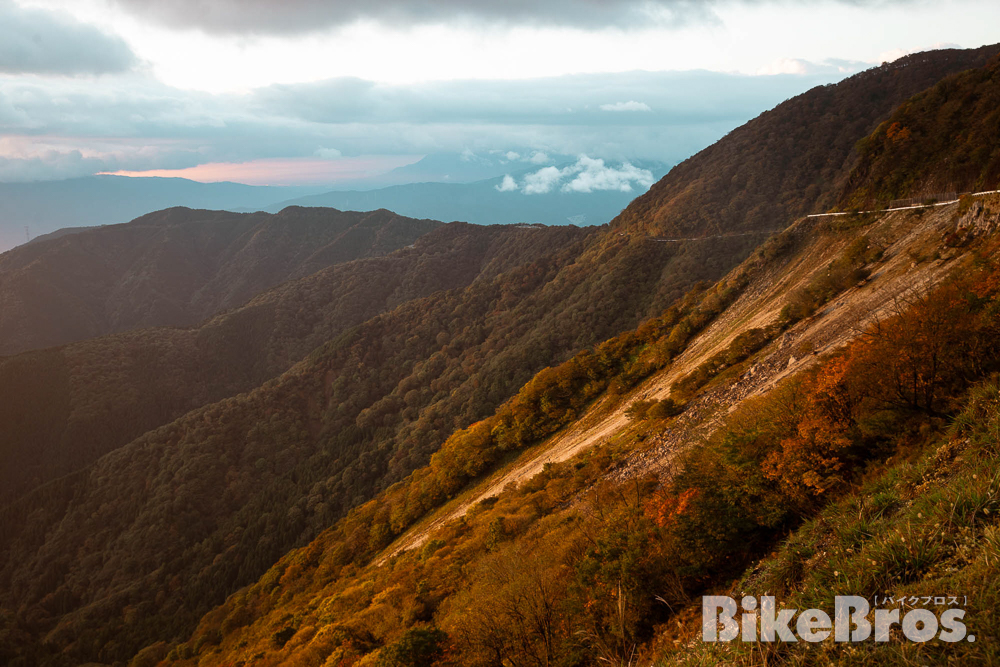 カーブはきつすぎず、ゆるいS字が続きます。180度ターンするような難しいコーナーは、3〜4つほどしかありません。オートバイビギナーを連れてくるにも、パートナーとタンデムで訪れるにも、適度なワインディングです。樹間が広がるにつれて、斜面の黄や橙が面になって見え始めました。路肩に風景が開ける場所では、東を向けば関ヶ原、西を向けば琵琶湖側の斜面という並びで、立ち位置を変えるだけでまったく違う景色が収まります。ここで最初の短い停車。東西を一枚ずつ撮って、再びゆっくりと発進しました。