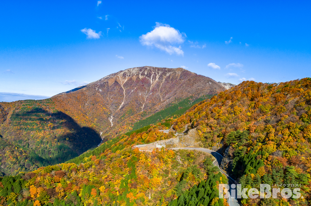 カーブはきつすぎず、ゆるいS字が続きます。180度ターンするような難しいコーナーは、3〜4つほどしかありません。オートバイビギナーを連れてくるにも、パートナーとタンデムで訪れるにも、適度なワインディングです。樹間が広がるにつれて、斜面の黄や橙が面になって見え始めました。路肩に風景が開ける場所では、東を向けば関ヶ原、西を向けば琵琶湖側の斜面という並びで、立ち位置を変えるだけでまったく違う景色が収まります。ここで最初の短い停車。東西を一枚ずつ撮って、再びゆっくりと発進しました。