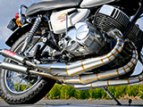 前シリンダー用チャンバーは、純正プレートのマウント位置を流用しながらステップやサイドスタンドとの干渉を巧みに避けながらレイアウト。サイレンサーに向けた立ち上がり角度も絶妙だ。