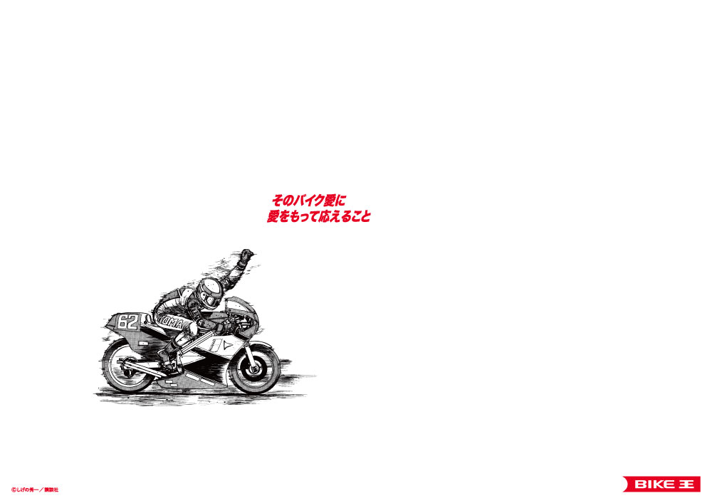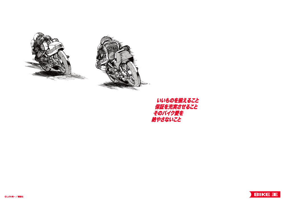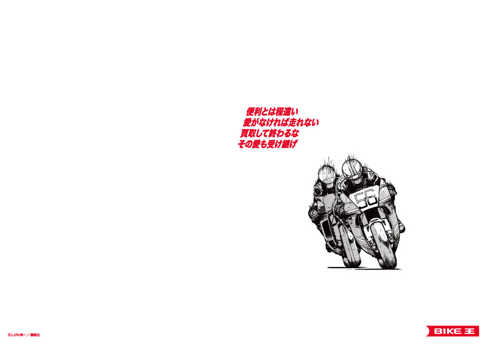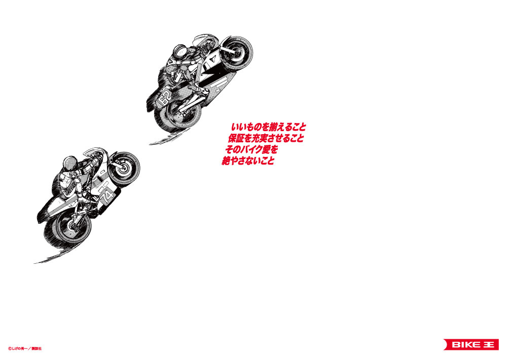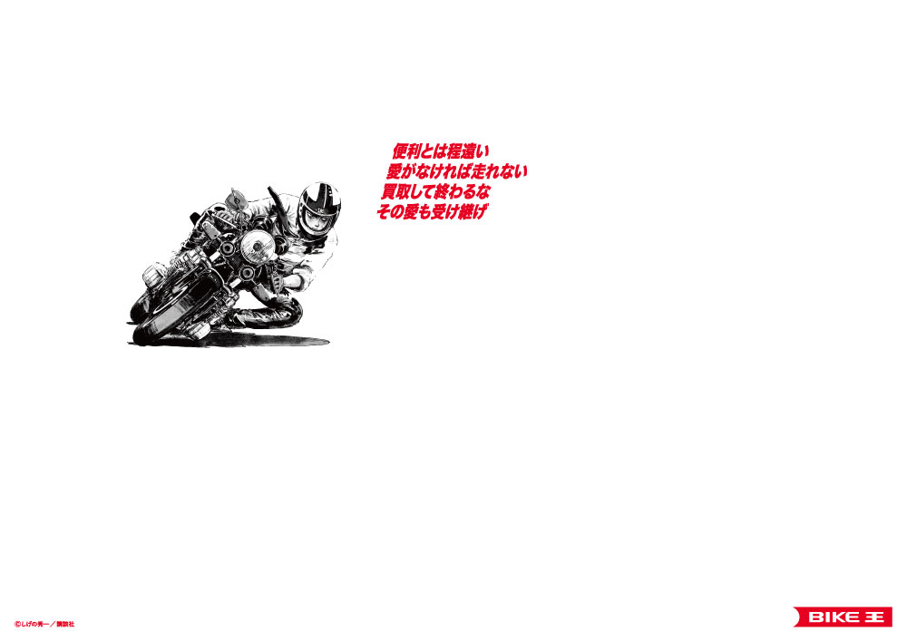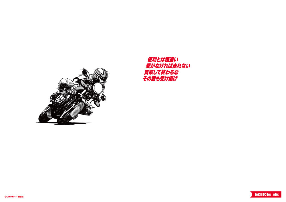 ではなぜ今回バイク王が“バリ伝”とコラボしたのでしょうか? その答えはバイク王が新たに採用したキャッチコピー「バイク愛と」にあります。“バリ伝”では主人公の巨摩郡(コマグン)が峠で走れなくなった愛車CB750Fを一晩かけて自らの手で押して戻ってくる、なんてシーンに代表されるように、バイクに対する愛が随所に描かれています。便利さとは程遠い、しかし愛がなければ走れない「バイク」という乗り物に対するリアリティと情熱を描ききった“バリ伝”の物語は、バイク王があらためてライダーに伝えたい「バイク愛と」というメッセージと深く共鳴するもの。以前から「単にバイクを売買するだけでなく、オーナーのバイク愛やその感動などを後世に受け継ぐことで、将来のバイク文化の発展につなげていくことが使命」と語り続けてきたバイク王の熱い想いは、いわば愛のバトンパス。「バイク愛」というキーワードで、“バリ伝”の世界観とがっちりリンクしているんです。