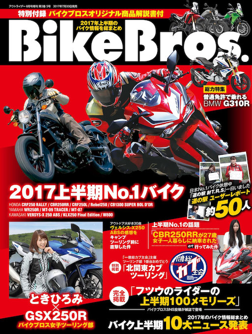 「バイクブロス2017」創刊号では、2017年上半期に発売されたバイク情報を総括、普通二輪免許で乗れる最新モデル情報をはじめ、お勧めツーリングエリア等をまとめています。またバイクブロスが運営している、国内最大級のバイク専門ポータルサイト「バイクブロス」のデータから2017年上半期のニューモデルを総まとめ、さらに「バイクブロス」サイト内のSNSと連動したバイクユーザー投稿企画も実施。バイクブロスが出版する雑誌「ロードライダー」、「ガルル」、「アウトライダー」、「モト・メンテナンス」、「二輪生活」などの各雑誌編集部員が総力を結集し、それぞれの専門分野でおすすめしたい情報を持ち寄ることで、多様なバイクライフ情報を一冊に凝縮しています。まさに今までになかった本当の意味での総合バイクマガジンと言えるでしょう。