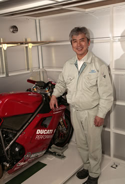 同社社長の光岡主税(ちから)さんはバイク好きで、自分たちから発信できる製品作りとしてバイクの保管に注目。プレス板金や溶接など、普段は生産ラインを生産している設備を活用してコンパクトなバイクガレージの開発に着手した。
