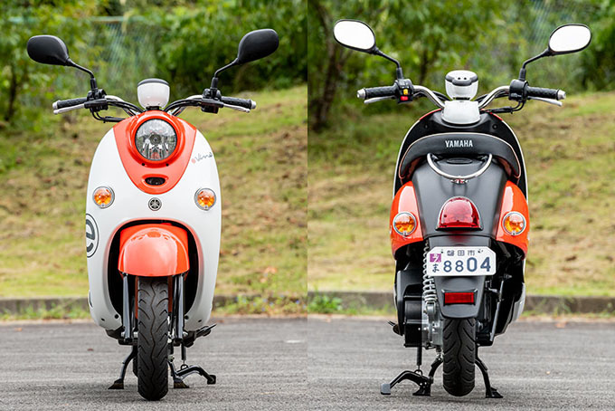 1997年の初代モデルの登場以来、レトロフューチャーなデザインが踏襲され続けているVino。ストリートに溶け込むという面ではいいが、むしろ原付EVならではのデザインを用いても良かったかもしれない。