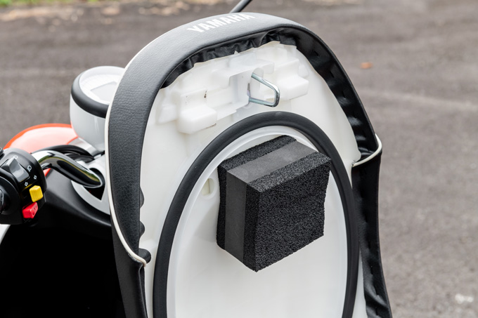 メインスタンドを掛ける際に利用するグリップは、キャリア的な役割も兼ねている。外装は2代目Vinoを流用しているため、ガソリンモデルでは給油口が配置される部分に、カバーが装着されていることが分かる。