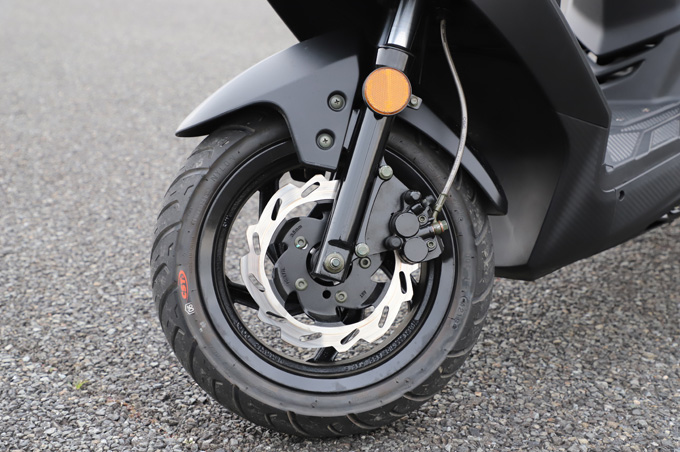 フロントブレーキディスクは226mmのウェーブタイプ。リアブレーキも同時にかかるコンビブレーキを採用している。タイヤサイズは110/70-12で、チェンシン製を履く。