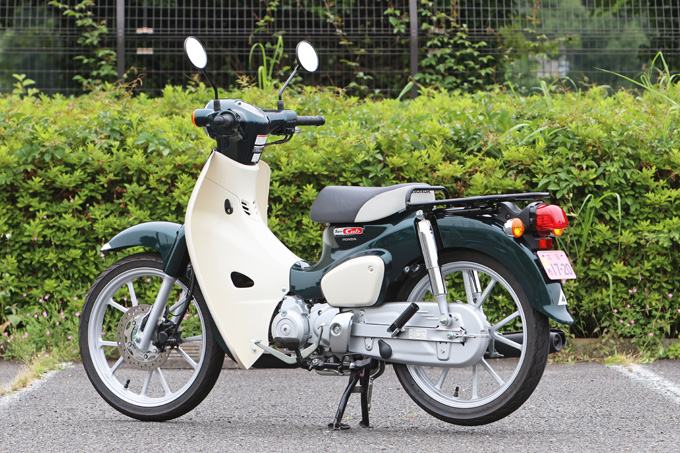 まず、エンジンは新型となり、最新の平成32年(令和2年)排出ガス規制に対応した。これはモンキー125などに積まれた新型の横置き空冷単気筒エンジンがベースで、内径×行程が47.0×63.1mmという超ロングストローク設定となった。次に外見上で目を引くのが、キャストホイールの採用だ。スーパーカブのラグジュアリー版であるC125には採用されていたが、スタンダードなスーパーカブもついにキャストホイールが導入された。これにより、タイヤもチューブレスとなった。さらにフロントブレーキはディスク化され、ABSも標準装備となった。また、メーターパネルは液晶ディスプレイを備えたタイプとなり、ギアポジションや時計、燃料計などが表示可能になった。
