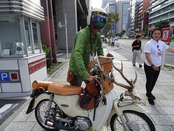静岡からの“荒木”さんは以前にもご登場いただきました。たくさんの旅の写真を飾っていると自然とお声も掛かり、カブを囲んで楽しそうな人の輪ができていました。