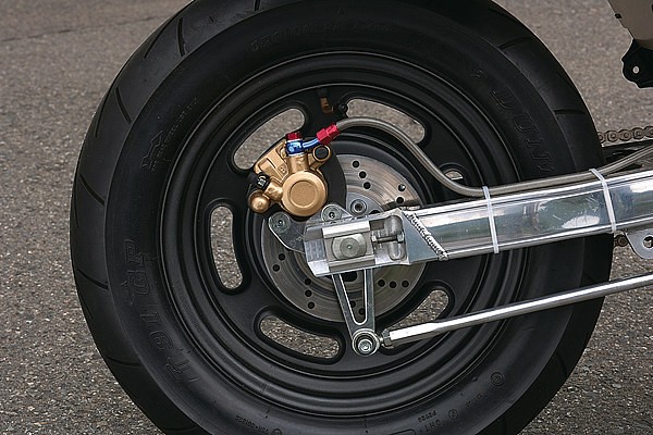 エンジンチューニングによってその走りが激変したことで、どうしても気になってしまうのがブレーキ性能だ。このマシンの場合は、スペシャルハブと純正鉄ホイールを組み合わせ、ディスクブレーキ化を実現。