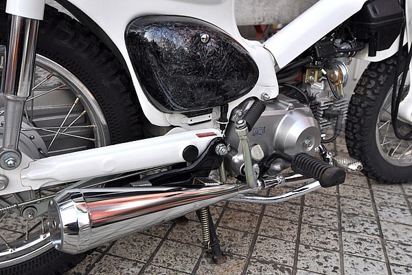 低音の効いたキレの良いサウンドを実現するメガホンマフラーを採用。ボディ全体はホワイトだが、特殊な塗装が施された黒ベースのサイドカバーがアクセントに。