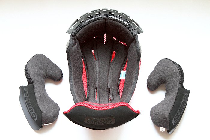 このCROWN HELMET CR-IIは内装フレキシブルシステムを採用。これは、EPSという高圧縮スポンジをワンサイズにすることで、内装交換のみでM~XLのサイズ変更が可能になるというユニークなシステム。付属する内装以外は別売りとなるものの、購入後に「もうワンサイズ大きければよかった……」という悩みが解決するほか、センターパッドとチークパッドを別のサイズにするなど、使う人の好みや頭のサイズに応じた、きめの細かいカスタマイズができる仕組みだ。