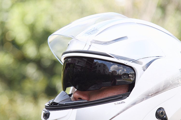 まぶしい日差しをカットしてくれる、スモークのインナーシールドを標準で装備。シールドの上げ下ろしは、本体左側にあるレバーを操作するだけ。ワンタッチで素早く上下することが可能だ。