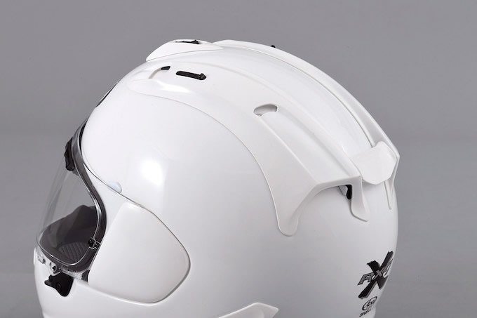 突起部を無くした事例としては、従来ではシールドの取り付け部にできていた段差を解消し、シェルの上部から側面までの形状をよりスムーズにすることで、衝撃をかわしやすい理想的なフォルムへと変更された。文字にすると簡単そうだが、実際はかなり困難な変更であり、シールド開閉軸を24㎜も下方へ移動する必要があったという。そのため、従来のシールド取り付け方式では対応できなかったため、開閉軸のデュアル化とピンレールを組み合わせた新シールドシステム「VAS」を開発することとなった。シェルに装着された空力パーツも新設計となっている。高速走行時に後方に発生する乱気流を軽減するとともに、吸気効率も従来比で向上。防音や防水面も改善され、走行中の快適性アップに大きく貢献している。